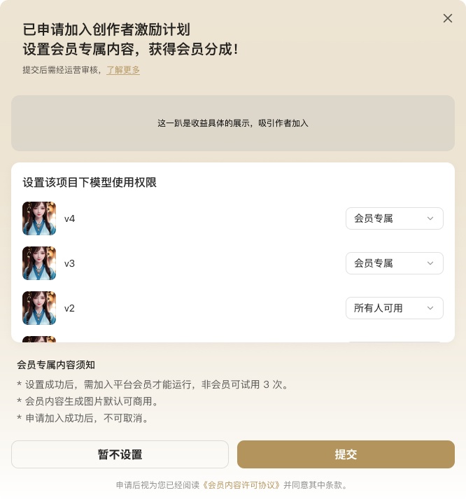 每一次会员使用和每一个会员拉新,都会为会员模型的创作者带来一份高分成的收益