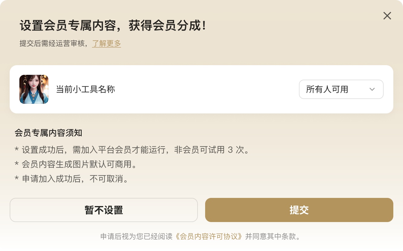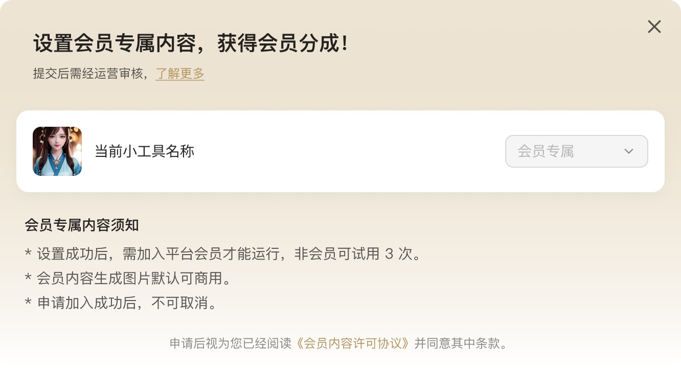 点击AI小工具详情页面,昵称下方【设置会员专属内容,获得会员分成】,即可进入【会员AI小工具申请入口】