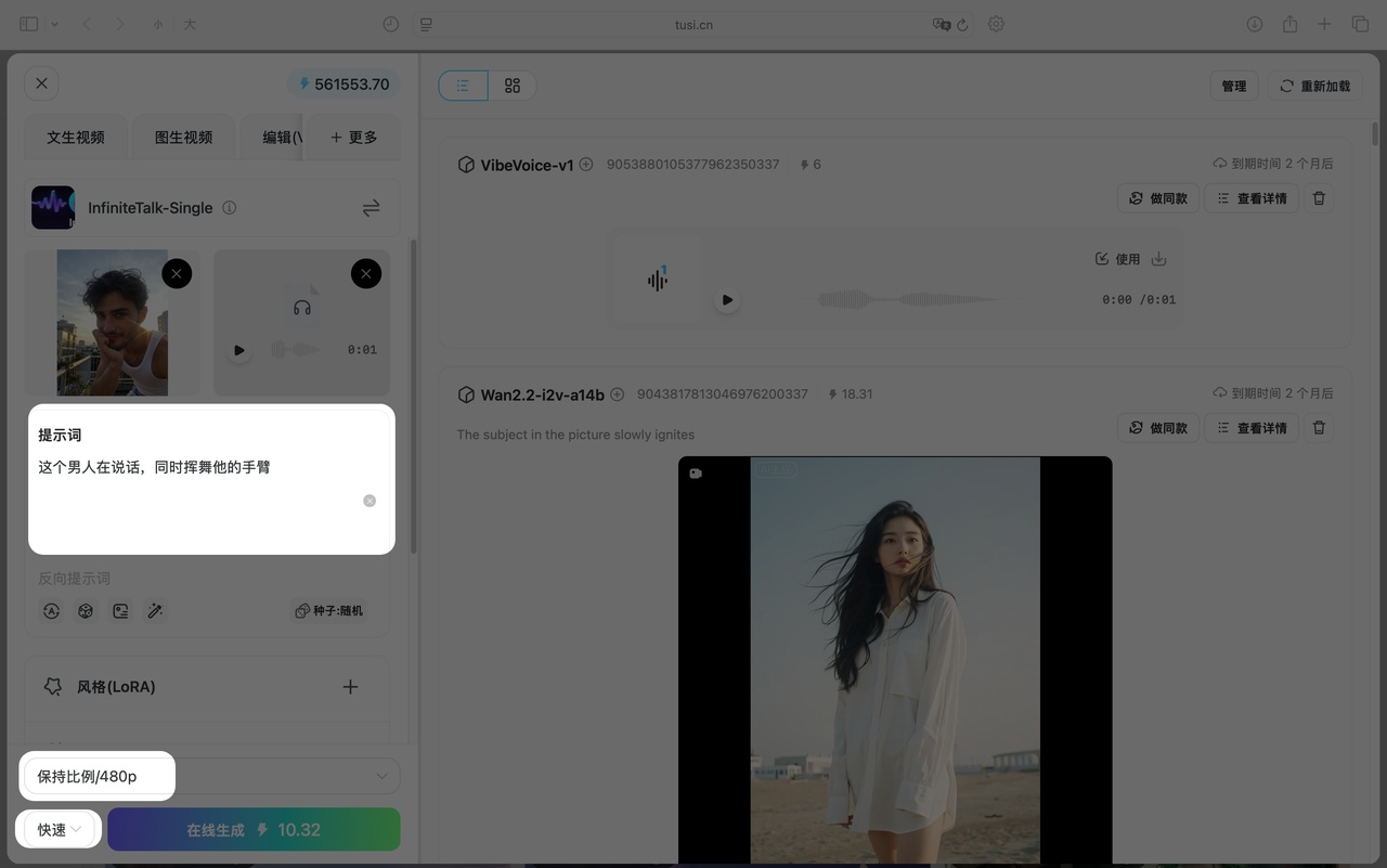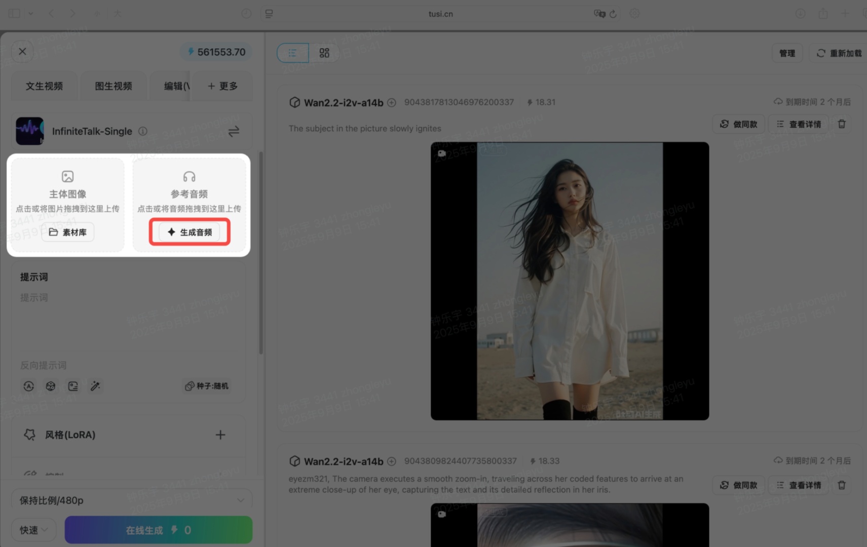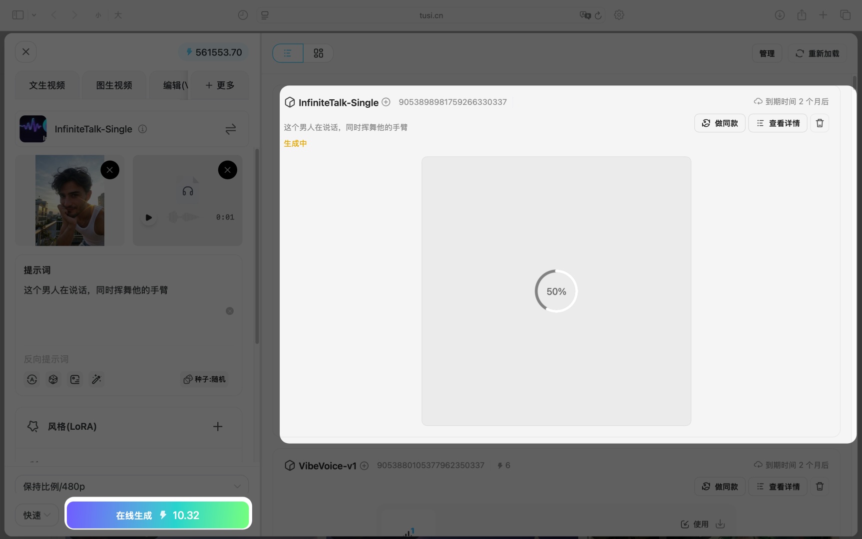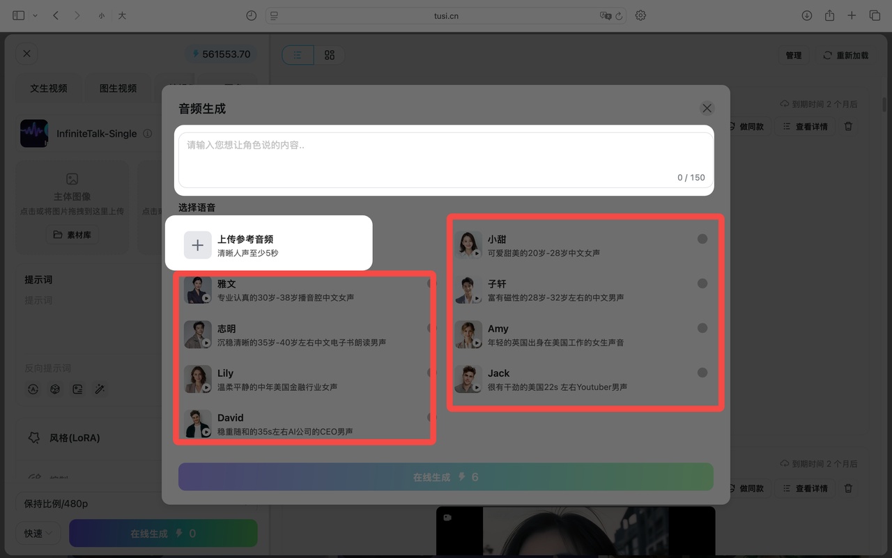 选择好模型之后需要上传图像或者音频。 考虑到找到合适音频文件是一件相对困难的事情,我们同时支持了在线音频克隆功能,点击“生成音频”即可体验