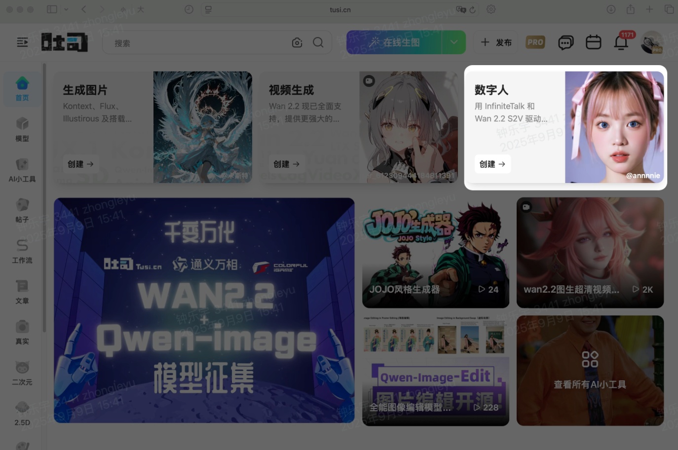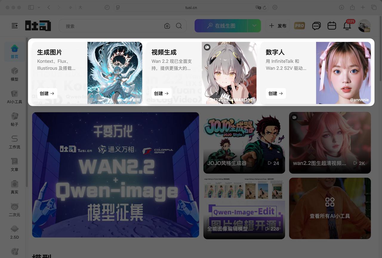 我们更新了通过吐司首页进入工作台生成图片/视频的入口,能够更简单的进入工作台开始创作 每个入口旁边的例图都是来自网站上用户优秀的作品,期待可以看到更多优秀的作品出现〰
