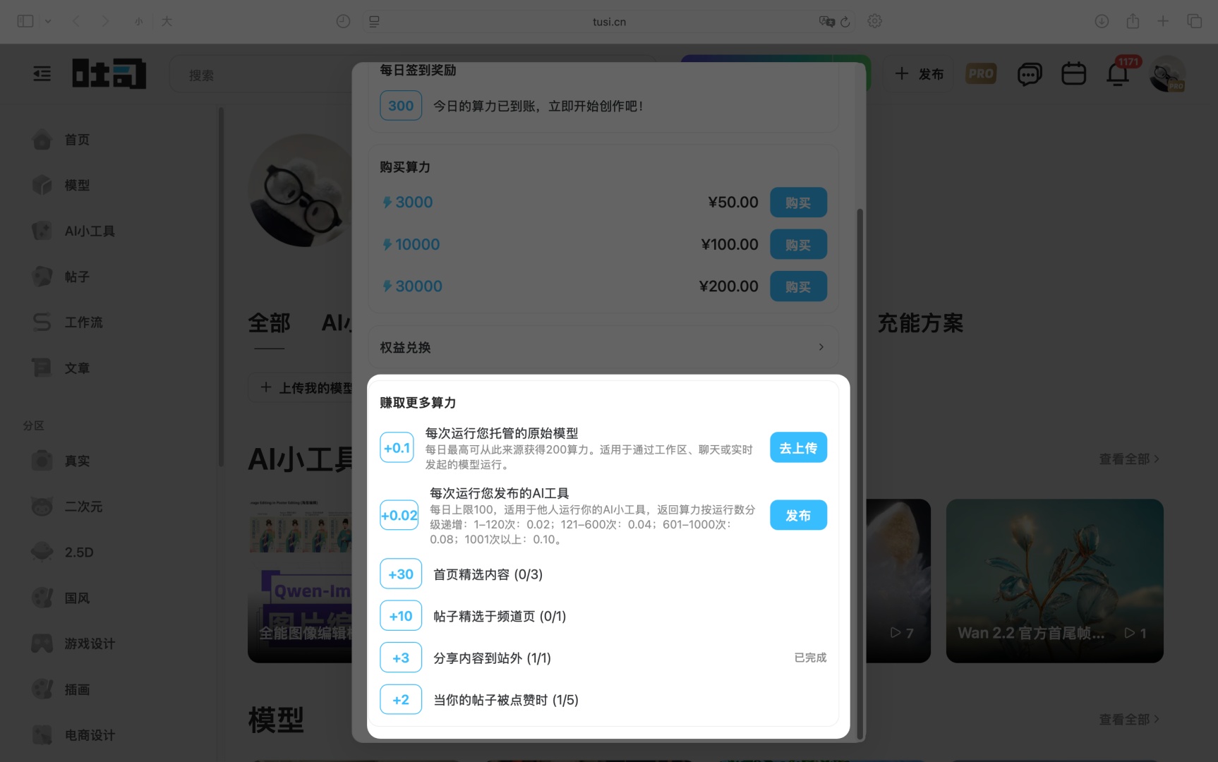 本次重点更新的内容为: (帖子 / AI 工具 / 模型) 被推荐到(首页/频道页)即可额外获得每日最高 100 的永久算力