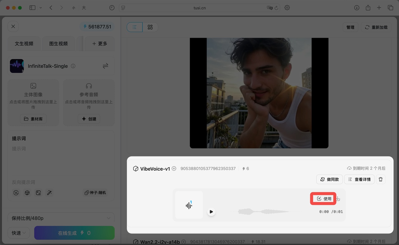 在你成功的生成所需音频之后,点击‘使用’即可应用到工作台中