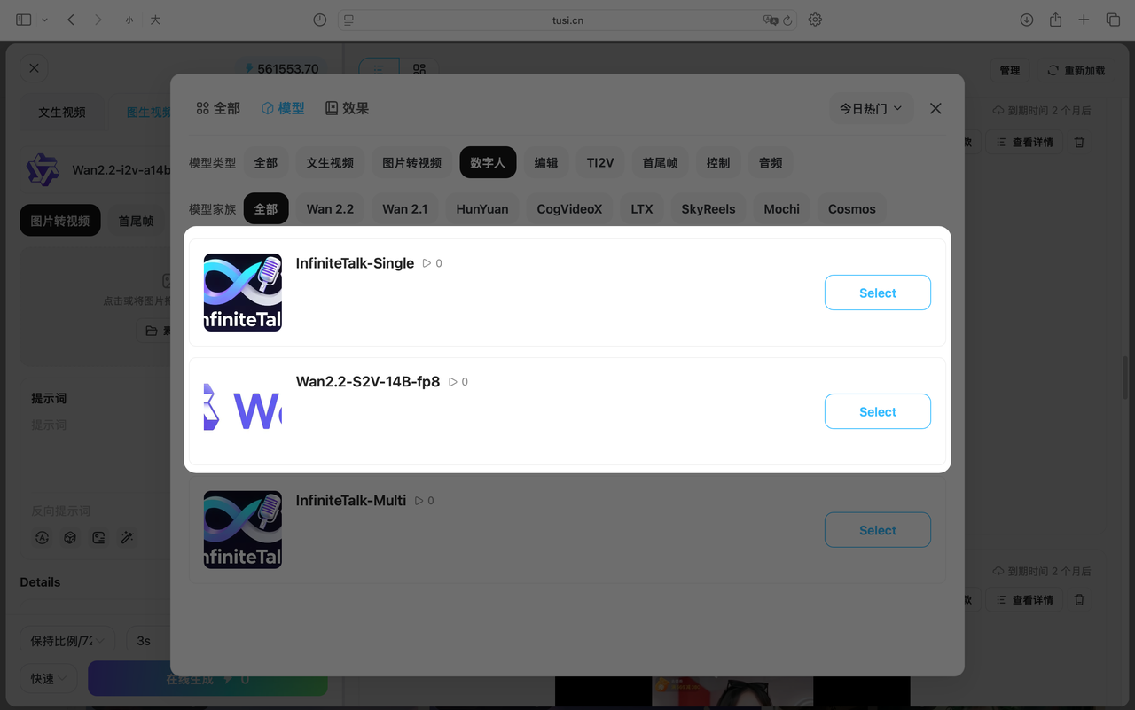 目前支持的模型有:Infinite Talk,WAN2.2-S2V