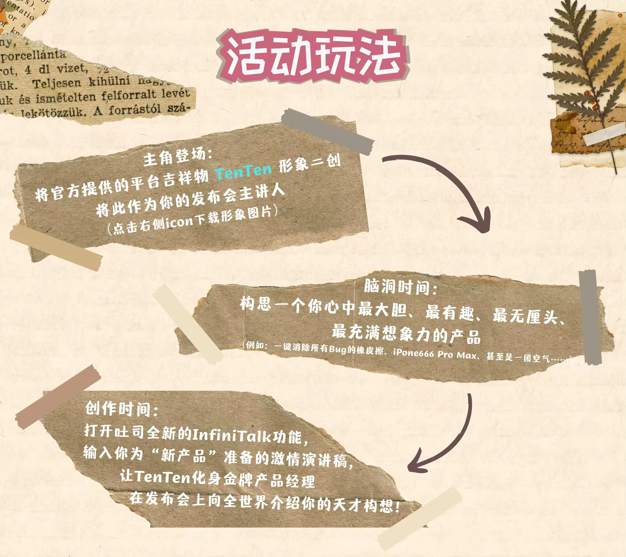 💡各位可以尽情地发挥想象力,构思最大胆、最有趣、最无厘头的产品,让TenTen为它代言
