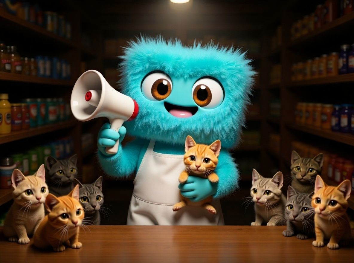 例如,我们把「猫咪」当作要发布的产品,围绕创意在提示词中加入了“宠物店背景”、“穿着围裙的店员”、“几只可爱的小猫”等元素