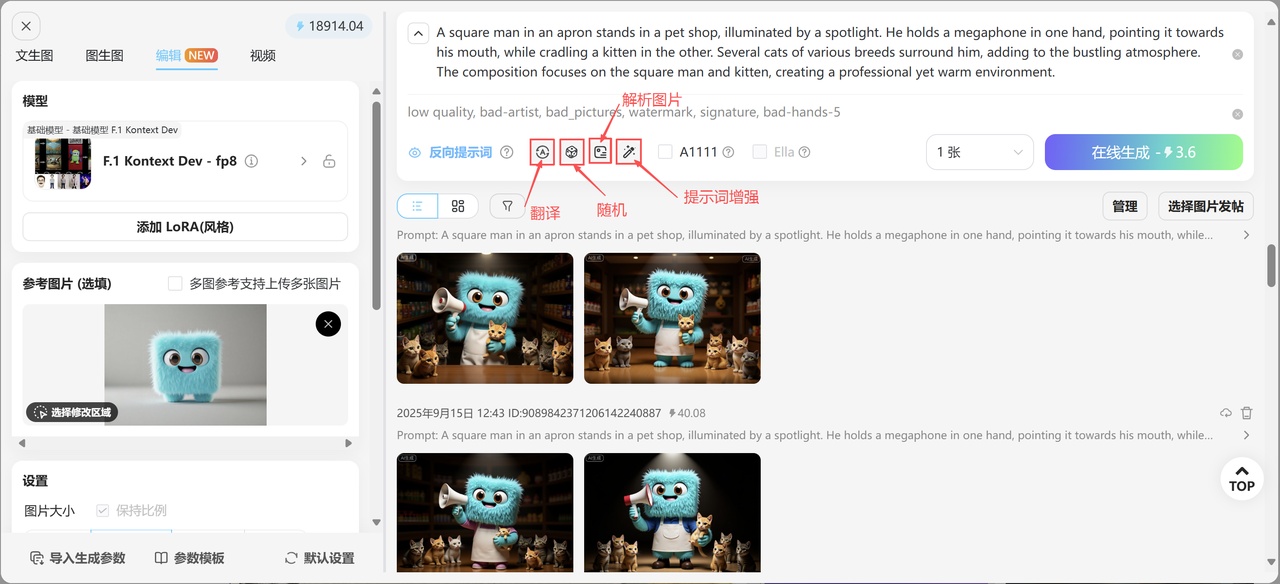 💡小技巧:灵感缺席时,可以使用上图标出的【翻译】【随机】等功能,一键生成提示词,解放思维!