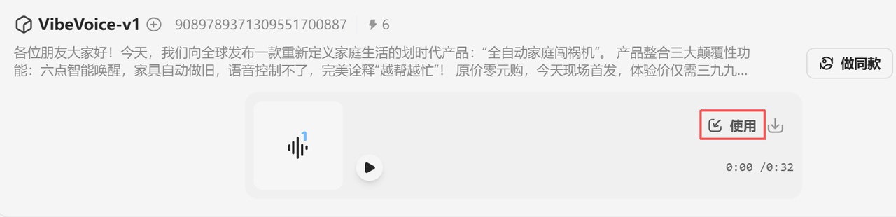 生成结果会出现在任务队列里,点击【使用】就可以自动填充到参考音频模块中啦
