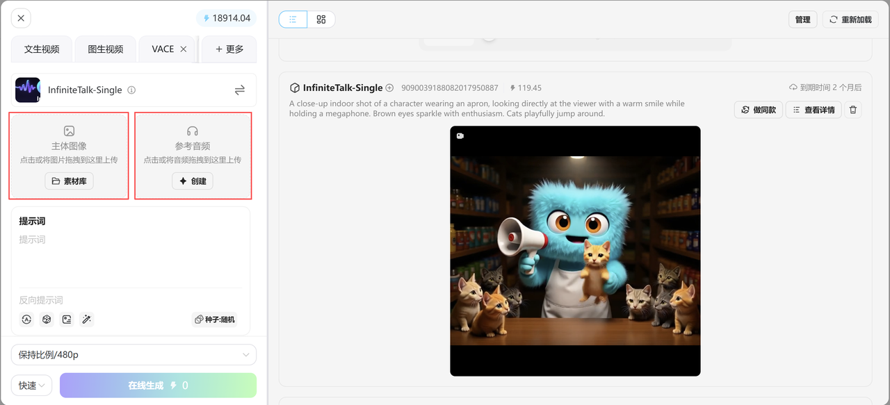 准备工作做好了,现在让我们把图片和音频素材打包丢给InfiniteTalk模型,等待魔法的发生~