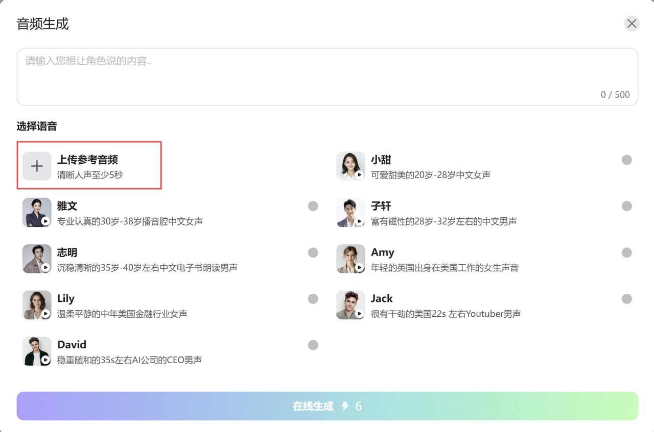 如果你想让吐司帮助你生成音频,则需要点击【创建】,输入你想让角色说的话,并选择角色的音色(可以通过上传参考音频自定义音色哦)