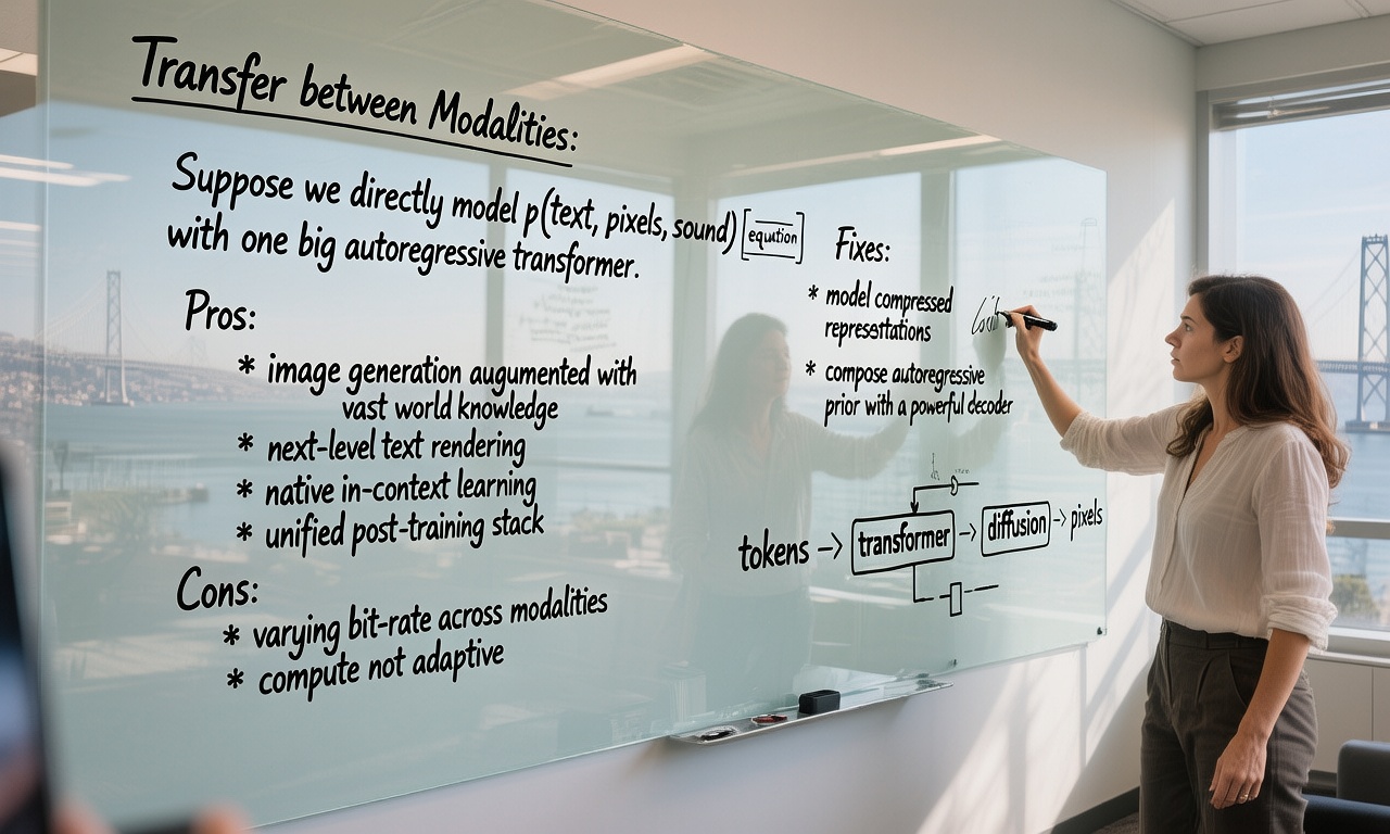 提示词:A wide image taken with a phone of a glass whiteboard, in a room overlooking the Bay Bridge. The field of view shows a woman writing. The handwriting looks natural and a bit messy, and we see the photographer's reflection. The text reads: (left) "Transfer between Modalities: Suppose we directly model p(text, pixels, sound) [equation] with one big autoregressive transformer. Pros: * image generation augmented with vast world knowledge * next-level text rendering * native in-context learning * unified post-training stack Cons: * varying bit-rate across modalities * compute not adaptive" (Right) "Fixes: * model compressed representations * compose autoregressive prior with a powerful decoder" On the bottom right of the board, she draws a diagram: "tokens -> [transformer] -> [diffusion] -> pixels"