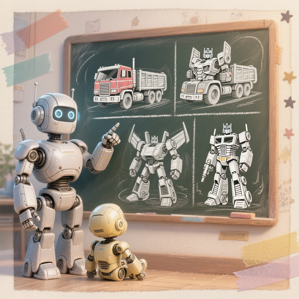 提示词:手帐风格,一个机器人,在给机器人宝宝,介绍擎天柱的变身过程,黑板上用四宫格画出了擎天柱变形的过程