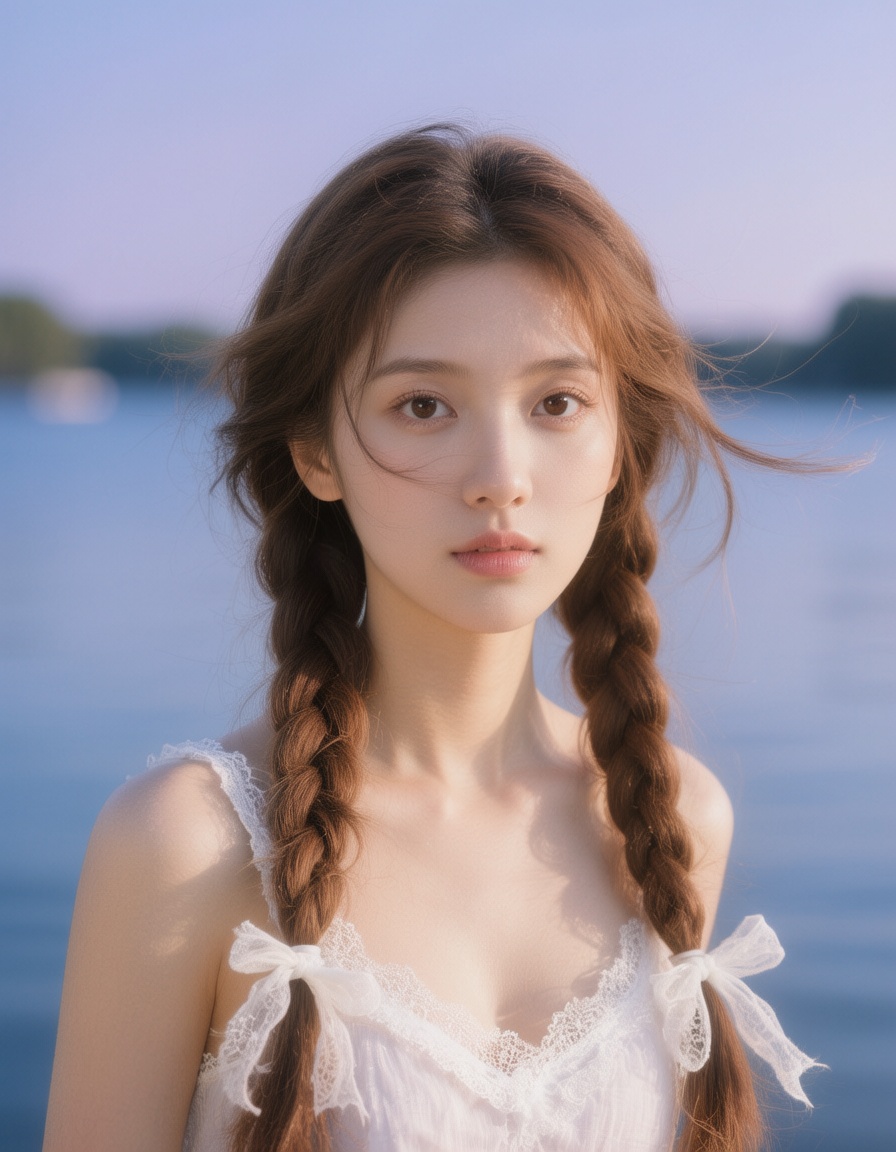 提示词:主体是一位年轻的东亚女性,具有白皙细腻的皮肤。她的脸型偏鹅蛋脸,五官清秀。一双大而明亮的深棕色眼睛正直接注视着观察者,眼神显得平静而专注。她的眉毛颜色与发色相近,形状自然。鼻子小巧挺拔,嘴唇丰润,涂着淡粉色的唇彩,嘴角微微抿起。她的棕色头发富有光泽,被整齐地中分,并编织成两条粗细均匀的麻花辫,自然地垂落在胸前两侧。每条麻花辫的末端都用一条白色的、带有褶皱的布质发带系成了小巧的蝴蝶结。额前和脸颊旁有一些细碎的刘海和发丝被风轻轻吹动,增添了一丝动感。她穿着一件白色的吊带上衣,材质看起来轻薄透气,可能是棉质或亚麻。上衣的领口和肩带部分装饰有精致的白色蕾丝花边,呈现出波浪形的边缘。她的肩膀裸露在外,皮肤光滑。光线从她的右前方照射过来,在她的脸颊、鼻梁和锁骨处形成了明显的高光,使得面部轮廓更加立体。背景是一片广阔的水域,水面平静,呈现出深邃的蓝色。水域的尽头是模糊的陆地轮廓,可以看到一些深绿色的树木丛生。更远的天空是清澈的淡紫色,暗示着这可能是黄昏或清晨时分。整体色调温暖柔和。