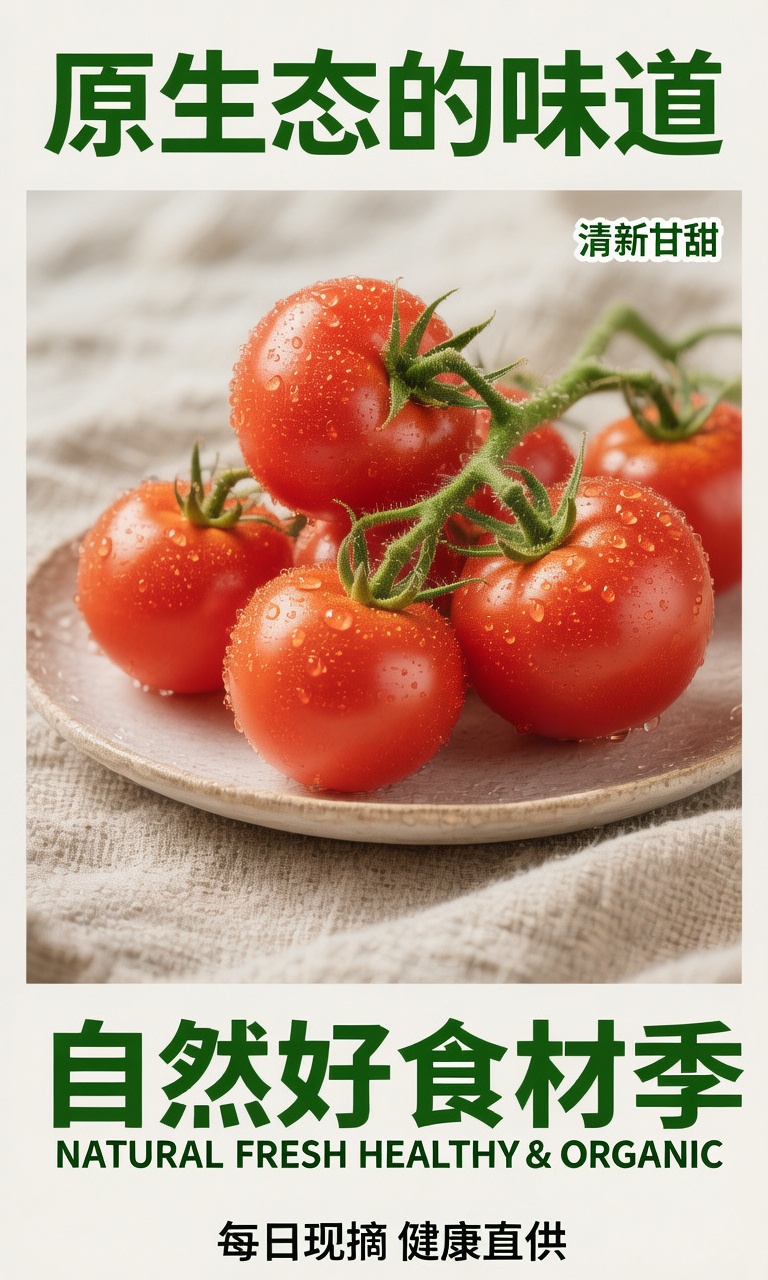 再如有复杂文字要求的海报类需求,混元图像3.0也可以很好地生成。海报商品图中,西红柿水珠新鲜饱满、红润欲滴、质感诱人,具备高品质拍摄质感,同时海报中顶部、底部、点缀等各处的文字都能顺利呈现,画面层次清晰,整体配色与布局十分和谐,兼具美观与实用价值。
