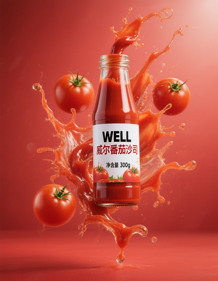 提示词:一张广告摄影商品广告,主体为一瓶悬浮的番茄沙司,周围是一些新鲜的番茄,红色飞溅而出,形成水花四溅的动态场景;场景设定为简洁的浓郁的红色为主,突出主体;风格写实且富有视觉冲击力;搭配番茄的鲜亮红色与水花的透明质感;采用中心构图,聚焦于番茄沙司瓶和飞溅的番茄;细节上要体现出水花的晶莹剔透以及番茄的新鲜饱满;瓶身带有 “WELL 威尔番茄沙司 净含量 300g” 等文字标识。