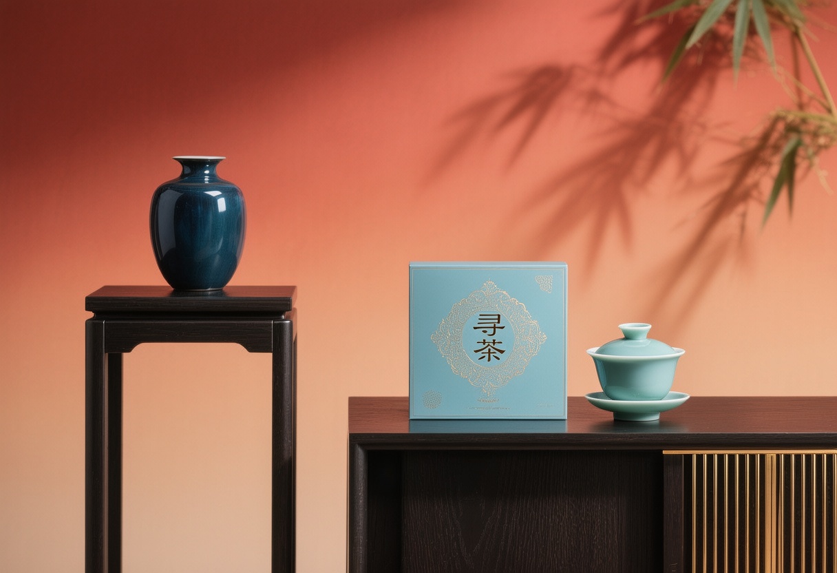 提示词:新中式禅意风格高端茶品静物摄影,主体包含浅蓝色 “寻茶” 茶盒(带精致中式文字与烫金纹饰)、天青色陶瓷盖碗(盖与碗、托搭配,釉面温润)、深蓝色釉面花瓶;场景设定为两件新中式深色木质家具(左侧高几、右侧矮几,矮几带有金色金属竖条装饰),背景是红橙色渐变(从上至深红到下至浅橙),且有竹叶的朦胧投影;风格参考东方美学与现代高端静物摄影,营造禅意雅致氛围;色调以红橙色渐变背景为底,搭配浅蓝(茶盒)、天青(盖碗)、深蓝(花瓶)、深棕黑(木质家具)、金色(金属装饰),色彩和谐且富有层次感;构图采用平视视角,元素呈对称式布局(茶盒与盖碗在右矮几,花瓶在左高几),营造平衡稳定的视觉效果;细节补充:竹叶投影柔和朦胧,木质家具纹理细腻,陶瓷器物釉面有温润光泽,金属装饰条质感精致,整体光线柔和,突出茶品的高端与东方文化意境。
