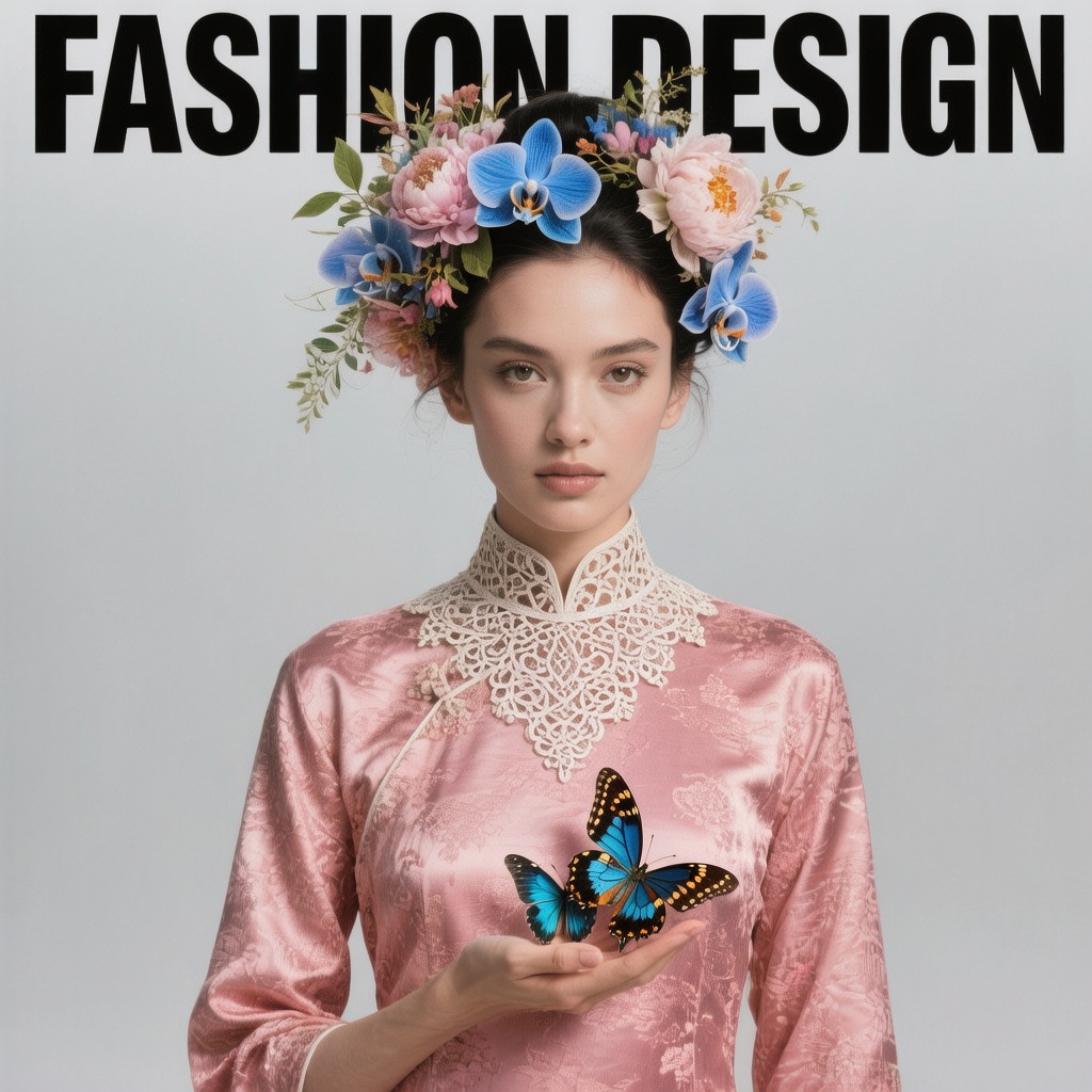 提示词:A beautiful woman wearing a pink cheongsam, floral headwear with colorful flowers in her hair, and an elegant white lace collar around her neck. She is holding large butterflies in one hand. The photography style features high-definition details, resembling a fashion magazine cover design. The text "FASHION DESIGN" is displayed at the top center of the photo. The background is a minimalist, light gray solid color, designed to highlight the model.