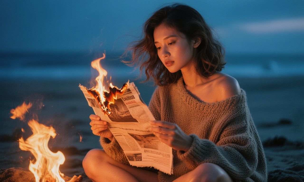 提示词:年轻的亚洲女性,皮肤因温暖的光线而闪闪发光,齐肩波浪形头发,超大针织毛衣从肩上滑落,晚上盘腿坐在海滩上的小篝火旁,手上拿一张正在燃烧的报纸,报纸被火烧到一半,深蓝色夜空下的高对比度暖橙色火光,电影胶片纹理,腰部向上拍摄