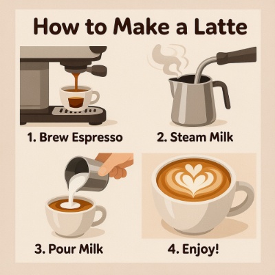 提示词:插画风格,介绍一杯拿铁的步骤教程图,需要有标题,并用英文说明步骤