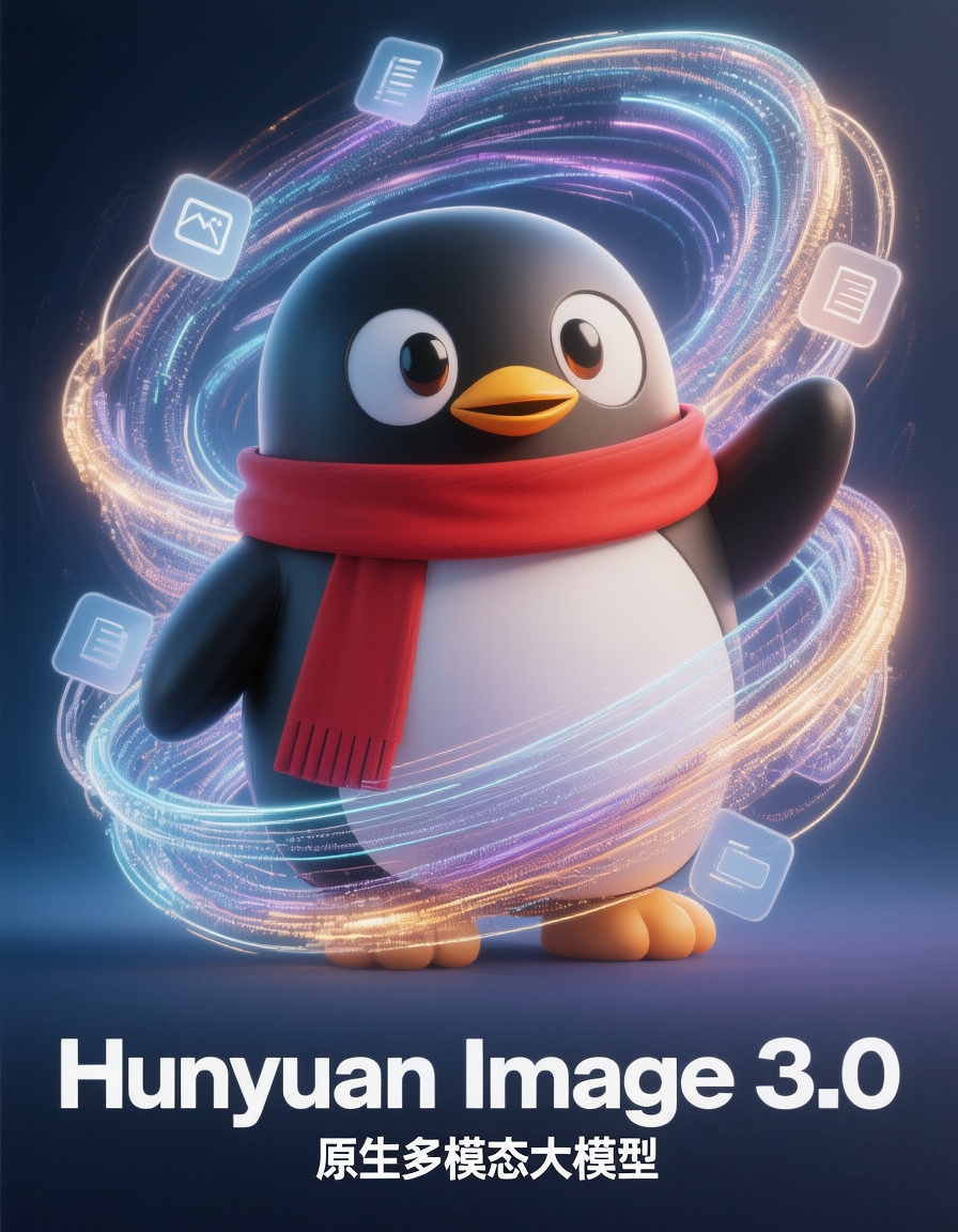 提示词:帮我设计一个海报,来宣传基于原生多模态架构的Hunyuan Image 3.0,有腾讯QQ元素,企鹅元素。