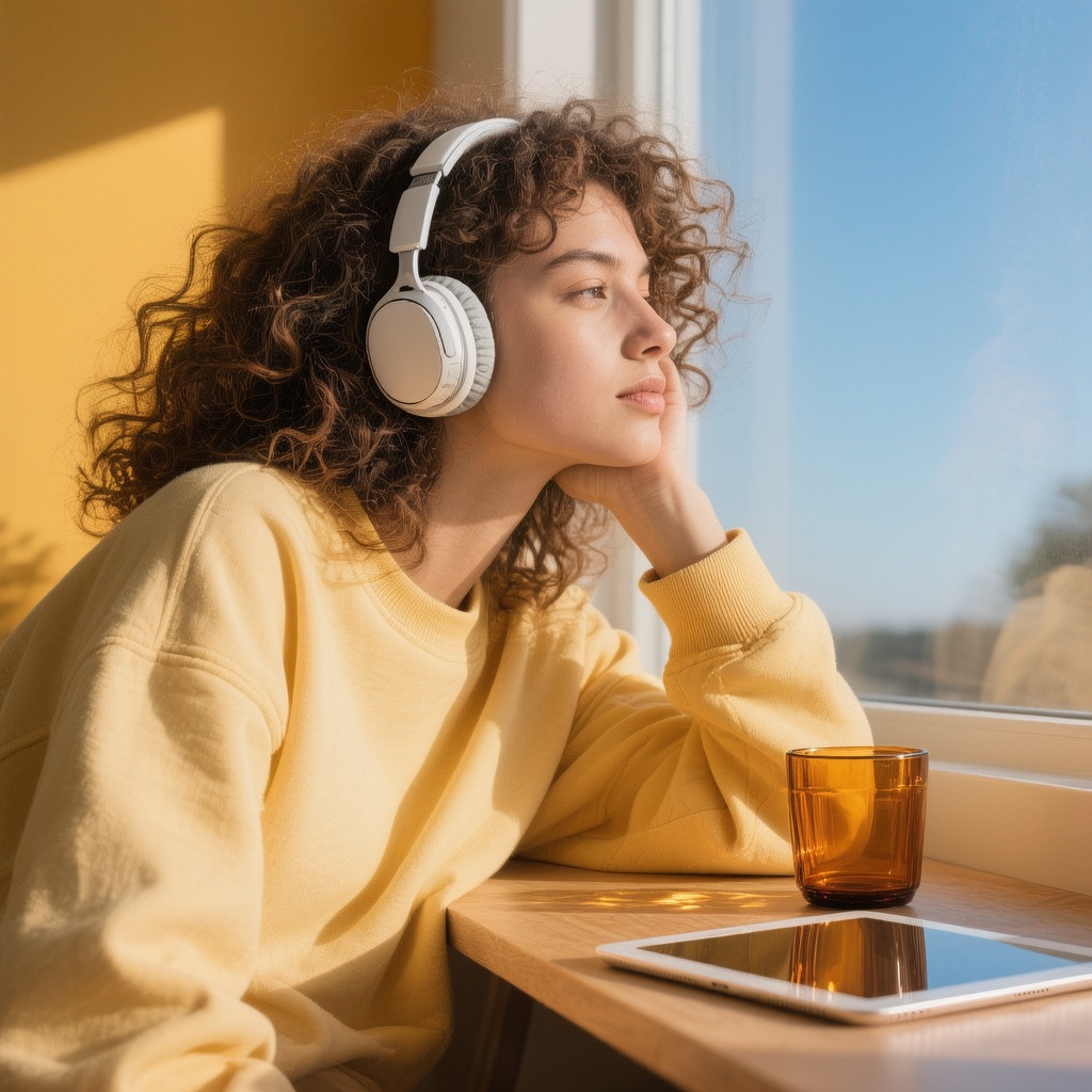 提示词:生活化高端产品摄影,主体为一位有着蓬松卷发的女性,佩戴头戴式耳机,身着淡黄色宽松卫衣;场景设定在阳光充足的室内窗边,背景是明亮的黄色墙面与澄澈蓝天;风格融合生活美学与产品展示的自然质感,强调温暖治愈的氛围;色调以暖黄色(墙面、卫衣)为主,搭配蓝天的清新蓝色,柔和的自然光形成细腻光影,营造出温馨惬意的感觉;构图采用侧面视角,人物呈放松姿态 —— 手肘支撑在桌面,手托着脸颊,目光向侧方舒展;细节补充:卷发的蓬松纹理、无线耳机的精致小巧、桌面上棕色玻璃杯的通透感与电子设备的简洁外观、自然光在墙面与衣物上的柔和投影,整体传递出舒适自在且充满生活暖意的氛围。