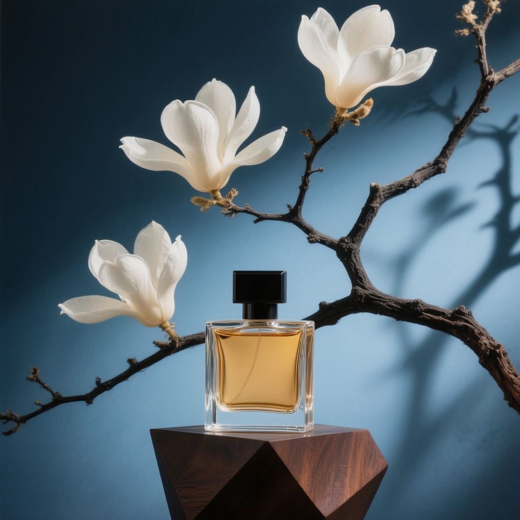 提示词:新中式禅意风格的高端香水产品摄影,主体为一瓶方形透明香水瓶(瓶内液体呈暖金色,搭配黑色瓶盖),放置在深棕色立体底座上;场景以深蓝色渐变背景为衬托,搭配造型简约的黑色树枝(带有清晰投影剪影)与三朵盛放的白色玉兰花,花朵具柔美自然质感;风格融合艺术感静物摄影与东方花艺美学;色调采用沉稳深蓝色(背景渐变)、暖金色(瓶内液体)、纯净白色(玉兰花)、深邃黑色(树枝与瓶盖),营造高级静谧氛围;构图为平视中心视角,香水瓶居于画面中下部,黑色树枝与白色玉兰花从右侧及上方延伸环绕,背景带有树枝投影细节,整体光线柔和,突出产品精致感与东方意境。