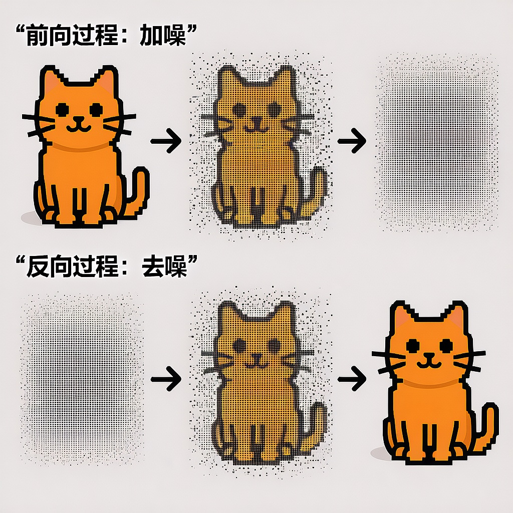 提示词:创造一副插画和简单的文字介绍扩散生成模型的原理