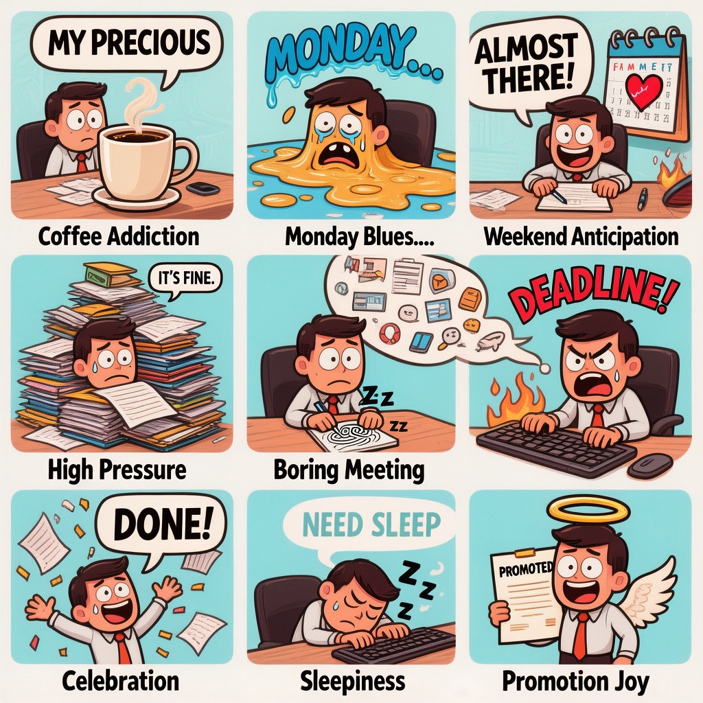 提示词:Generate a 3x3 grid of office worker memes featuring the following themes: 1) Coffee Addiction 2) Monday Blues 3) Weekend is Coming! 4) High Pressure 5) Boring Meeting 6) Angry Keyboard Typing 7) Celebration 8) Sleepiness 9) Promotion Joy.