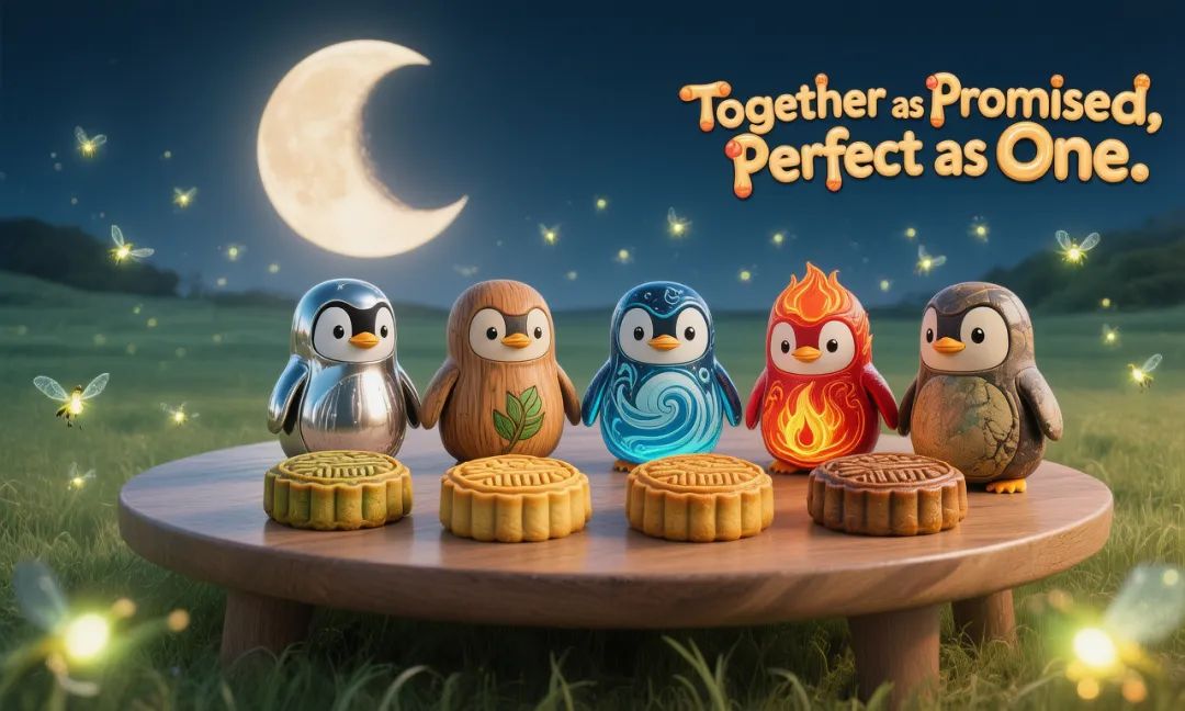 这张体现有月亮、企鹅和月饼的中秋节创意海报,混元3.0也能很好地完成。