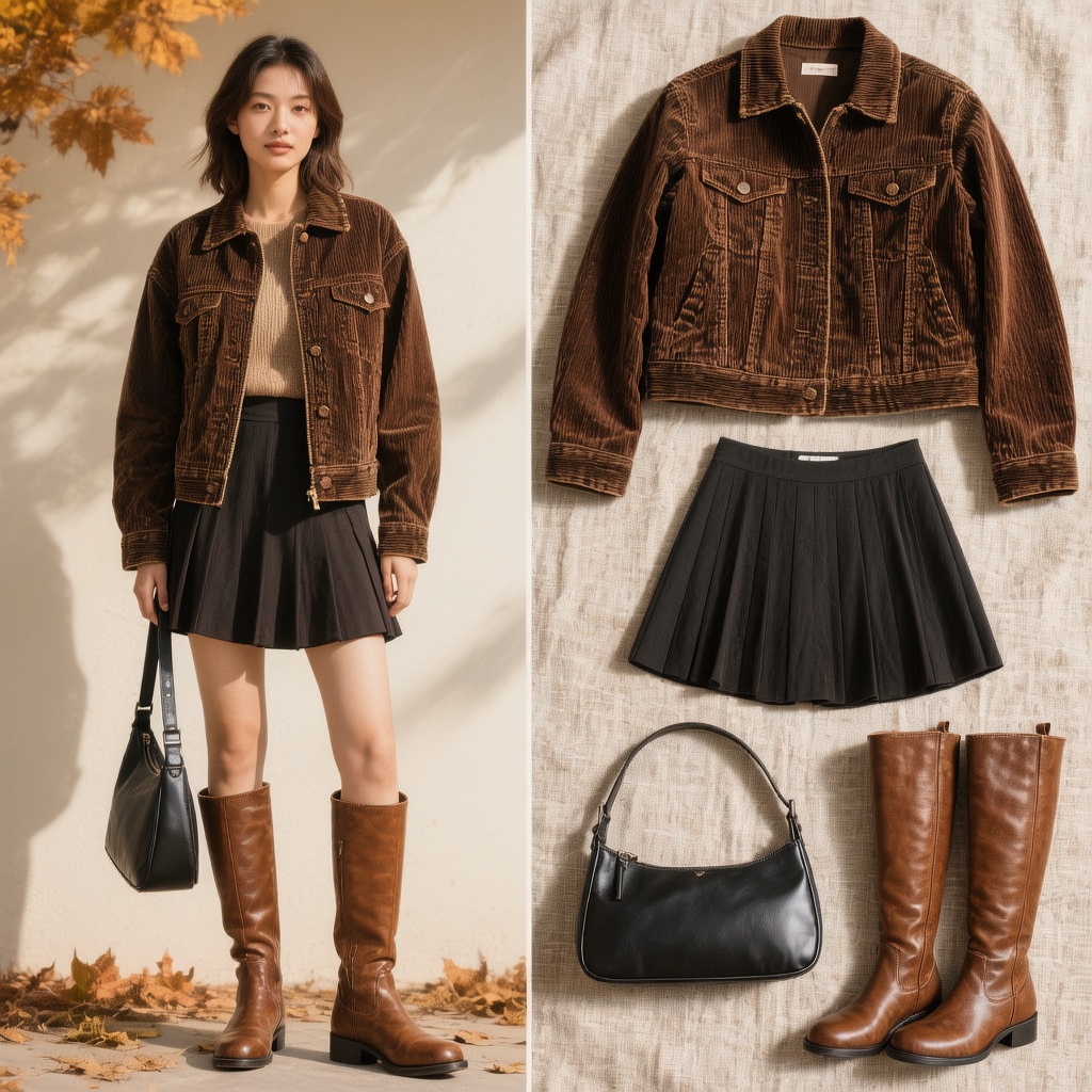 比如输入:“你是一个小红书穿搭博主,请根据模特穿搭生成一张封面图片,要求: 1.画面左侧是模特的OOTD全身图 2.右侧是衣服的展示,分别是上衣深棕色夹克、下装黑色百褶短裙、棕色靴子、黑色包包 风格:实物摄影,要求真实,有氛围感,秋季美拉德色系穿搭”。