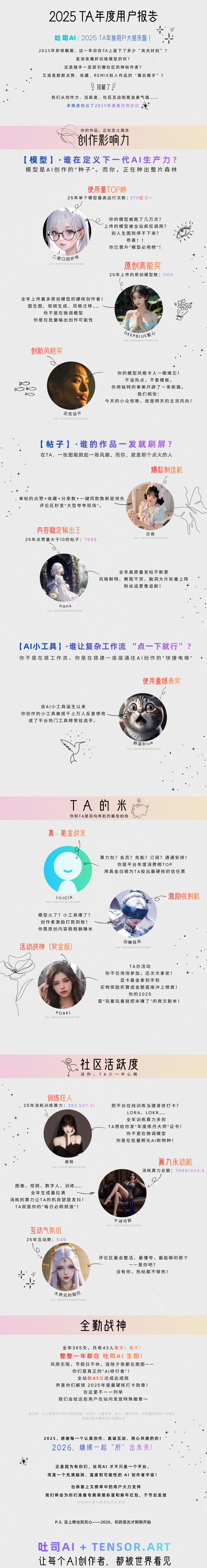 2025吐司年度用户大赏来啦tusiaiDec 31, 2025 6:52 AM 更新3 点赞技术前瞻2025年即将翻篇,这一年你在TA上留下了多少"高光时刻"?是深夜爆肝训练模型的你?还是随手一发就引爆社区的神帖作者?又或是默默点赞、收藏、REMIX别人作品的"幕后推手"?别藏了!我们从创作力、活跃度、社区互动到氪金豪气值......多维度挖出了2025年度最闪亮的你30tusiai关注