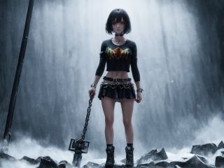 masterpiece,(bestquality),highlydetailed,ultra-detailed,illustration,Depthoffield,(Darkprison:1.2),cold,solo,(1girl),detailedeyes,(Hematicredeyes),(blackshorthair),bobhaircut,(tareme),(crazy),expressionless,(prisoner'sgarb),(long_sleeves),offshoulder,miniskirt,(MonsterEnergy:1.2),(heavymetal:1.2),(metaljewelry),choker,cross-lacedfootwear,cuffs,wristcuffs,(chain),hammer,(DemonArray),(666:1.2),Dryicefog