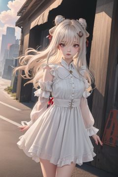 realistic,photorealistic,masterpiece,best quality,1girl,solo,(standing in street),looking at viewer,((masterpiece)),((best quality)),((official art)),(extremely detailed CG unity 8k wallpaper),((highly detailed)),((a girl)),(single),staring,fairy,hair_ornament,(very long hair),(messy_hair),bare shoulders,ribbon,hairs between eyes,beautiful detailed sky,close-up,arms behind back,thighs,mist-shrouded,chinadre,overexposure,solo,incredibly_absurdres,intense angle,pleated dress,single hair bun,white_hair,red_eyes,eyeshadow,eyeliner,eyes visible through hair,ribbon-trimmed sleeves,