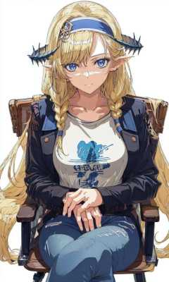 1girl,jeans,sitting,chair,crossed legs,white background,t-shirt,cowboy shot, origentou,headband