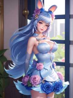 mature female, arms behind back, cityscape,night,facial mark,close-up, indoors,window, 1girl,blush,skirt,looking at viewer,standing,hair ornament, hair flower, dress, flower, rose,long hair,light blue hair,blue skirt,flower skiet,bangs, rabbit ears,  <lora:公孙离花间舞V2:0.8>,