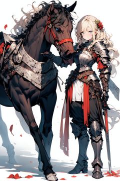 [(white background:1.5)::5], (imid shot:0.95), (full body:1.25),(masterpiece:1.2), best quality,game cg,armor, long hair, blonde hair, 1girl, blue eyes, horse, shoulder armor, breastplate, weapon, holding, looking at viewer, horseback riding, knight, gauntlets, faulds, riding, pauldrons, outdoors, sword, closed mouth, holding weapon, solo focus, standing, plate armor, armored boots, boots, day, bangs, parted bangs, petals, wind, wavy hair, feet out of frame, solo<lora:fantasy_20230707233406-000012:0.9>