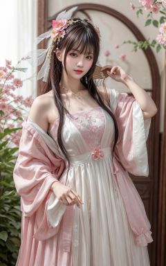 realistic,photorealistic,masterpiece,1girl, solo, dress, flower, pink background, black hair, holding, white dress, hair ornament, bangs, hair flower, brown hair, hand fan