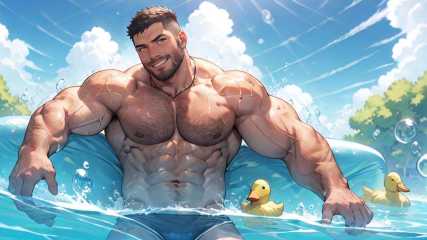mature male, muscular man, male focus, best quality, (looking at viewer), solo, sweat, abs, pecs, cloud, blue sky, in the pool, sweat, (Little yellow duck in the water), full body, topless, masterpiece, beard, bubble, sunlight, rainbow, fade haircut, ( bouncy castle), men's briefs, bara stocky,   <lyco:NiJiMale-16:0.4>