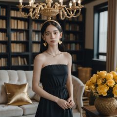 cowboy shot,yor_briar, 1girl, sweet girl, bare arms, black short dress, sidelocks, bare shoulders, bare arms, sleeveless, black hair, golden hairband, golden hair flowers, standing, ((upper body)), indoors, living room, sofa, decorations, chandelier, book stack,