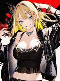 kayahara, 1girl, solo, blue eyes, jacket, smile, hair ornament, looking at viewer, breasts, bare shoulders, bangs, hairclip, off shoulder, sleeveless, skirt, black jacket, hand on hip, open jacket, cowboy shot, v, nail polish, open clothes, blonde hair, blue nails, grin, black skirt, long sleeves, yellow nails, jewelry
