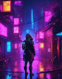 cyberpunk style, neon lights, rain, from behind, cyberpunk, night, city, scenery, facing away, solo, outdoors, science fiction, building <lora:cyberpunk_style_xl-off:0.8>