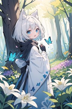 (masterpiece:1.2), high_quality ,occultism, Aestheticism Painting , (flat color), best quality, soft lighting, (depth_of_field:1.3),(solo:1.4), [close-up], (1girl), detailed beautiful blue eyes, (silvery hair) , wolf_ears, short_hair,archbishop_robe ,largr_sleeve, grey_cloak, blooming, looking_at_viewer, lily (flower) , blue butterfly, (fantastic colorful),fluorescence, (forest:1.25), tree_shade, (flowers meadows:1.4), flower, leaves, looking back, cute_fang, black gloves, long scarf,