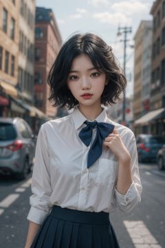 (black hair),posing,street,city day,1girl,extremely beautiful face,bust,put down hands,Random hairstyle,(JK_suit),(JK_shirt),JK_style,(dark blue JK_skirt),(bow JK_tie),white and clean skin,{{masterpiece}},{{{best quality}}},{{ultra-detailed}},{{illustration}},{{disheveled hair}},Enigmatic Atmosphere,Mellow Atmosphere,depth of field (dof),Chest Shot(MCU),Mid shot,Volumetric lighting,<lora:KCW_V6:0.8>,