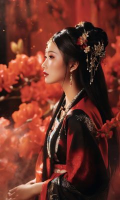 A poetic photography capturing a girl in elegant jin clothes, surrounded by swirling ink fluid effects. The girl's attire is adorned with intricate patterns, and she stands gracefully amid a sea of red and black. Her expression is serene as she gazes into the distance, lost in thought. The ink fluid gracefully dances around her, creating a dreamlike ambiance. Photographed in an intimate setting with soft lighting.