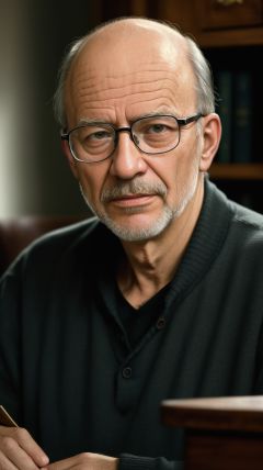 (editorial photograph of a balding, unshaven, tired, 70 y.o. male), (wearing worn out clothes, wearing glasses, detailed:1.3), (highly detailed face:1.4), (background inside dark, moody, private study, old furniture:1.3), (8k, uhd, dslr, high quality, cinematic lighting, bokeh), (dramatic, award winning photography, incredible masterpiece:1.3) (strong depth of field)