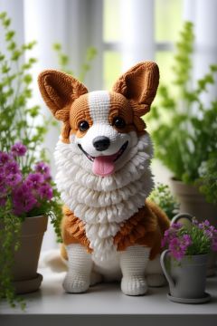 BJ_Sewing_doll, Corgi, solo, looking_at_viewer, sitting, flower, tongue, tongue_out, blurry, no_humans, blurry_background, animal, plant, potted_plant, animal_focus, watering_can,photo,8k,highly detailed,digital photography,hdr,realistic,high definition,<lora:SDXL_Sewing_dol_v2:0.7>,