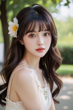 (detailed face, perfect face, perfect eyes, realistic eyes, perfect fingers),(clear face),fantasy girl,long hair,hair ornaments,looking at viewer,outdoors,beautiful girl,knees up,standing lolita1,dress,flower,(looking at the camera:1.2),portrait,(photorealistic:1.2),