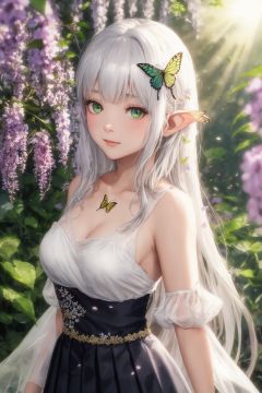 3D,photo,(the wonderland of elf),(((masterpiece))),(incredibly_absurdres),(best quality),(highres),((ultra-detailed)),(girl in the garden),(garden in the dream), (extremely fantasy dream),(an extremely delicate and beautiful girl),delicate face,beautiful detailed eyes,[1princess,elf,pointy_ears, flower, breasts, elf, long_hair, blonde and silver hair, very_long_flowing_hair, solo, detached_sleeves, yokozuwari, green_eyes, white_flower, butterfly_hair_ornament, bare_shoulders, bare_breast,medium_breasts, looking_at_viewer,(silver see-through gauze_dress:1.2),(gold trim glowing gauze_dress), hair_ornament, bangs: :0.66,(upper_body),focus on face,close up,dynamic angle,insect,animals,(bug, glowworm,butterfly,animal, , glowing butterfly,glowing fireflies,fireflies encircles the girl,(glowing)) (detailed light),feather, nature, (sunlight), flowers:0.33,girl in the garden,garden in the wonderland,beautiful and delicate wonderland,(painting),(sketch),(bloom),(shine),(All fireflies shine)(detailed background),(depth of field),backlight,(cinematic light),(lens_flare),(best shadow),(extremely delicate and colorful Wisteria Tunnel), (fairy tale and dreamy),High quality, ultra detail, ((Nahida, genshin impact,Green eyes,Nahida's character costume)),(watercolor medium:1.1), (ukiyoe style:1.21), (masterpiece:1.4641), (best quality:1.331), (illustration:1.1), (1girl:1.5), (solo:1.5), (an extremely delicate and beautiful:1.21), cute,looking at viewer,Medium lens,(She Hold the branches with small white flowers:1.23),(white background:1.3), (night sky with stars:1.2), (Sophora:1.2), (drooping branches with white flowers),(beautiful long white hair),(very long white hair),small breasts,(black pleated skirt:1.25),((white hair)),(collared shirt),(white stocking),collarbone,delicate hands:0.8