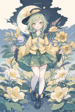 1girl,solo,hat,komeiji koishi,skirt,heart,shirt,thighhighs,green skirt,long sleeves,ribbon,looking at viewer,wide sleeves,third eye,frills,yellow shirt,hat ribbon,star (symbol),flower,green hair,black headwear,full body,short hair,blue eyes,blush,frilled sleeves,frilled shirt collar,gradient,green eyes,collarbone,frilled skirt,hat bow,yellow ribbon,bow,eyeball,floral print,yellow bow,blouse,parted lips,heart of string,bangs,open mouth,boots,