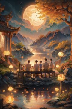 (((masterpiece))), ((extremely detailed CG unity 8k wallpaper)),(best illumination, best shadow, an extremely delicate and beautiful),(mid autumn Festival),qiuyinong, lantern, moon, paper lantern, multiple boys, night, full moon, scenery, sitting, water, east asian architecture, rock, tree, outdoors, architecture, sky, facing away, girls and boys, parent,family