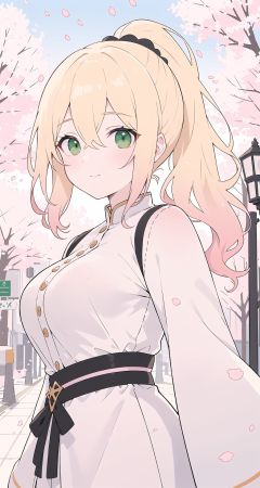 medium hair,wavy hair,blonde hair,green eyes,fantasy clothes,(white dress:0.8),large breasts,narrow waist,